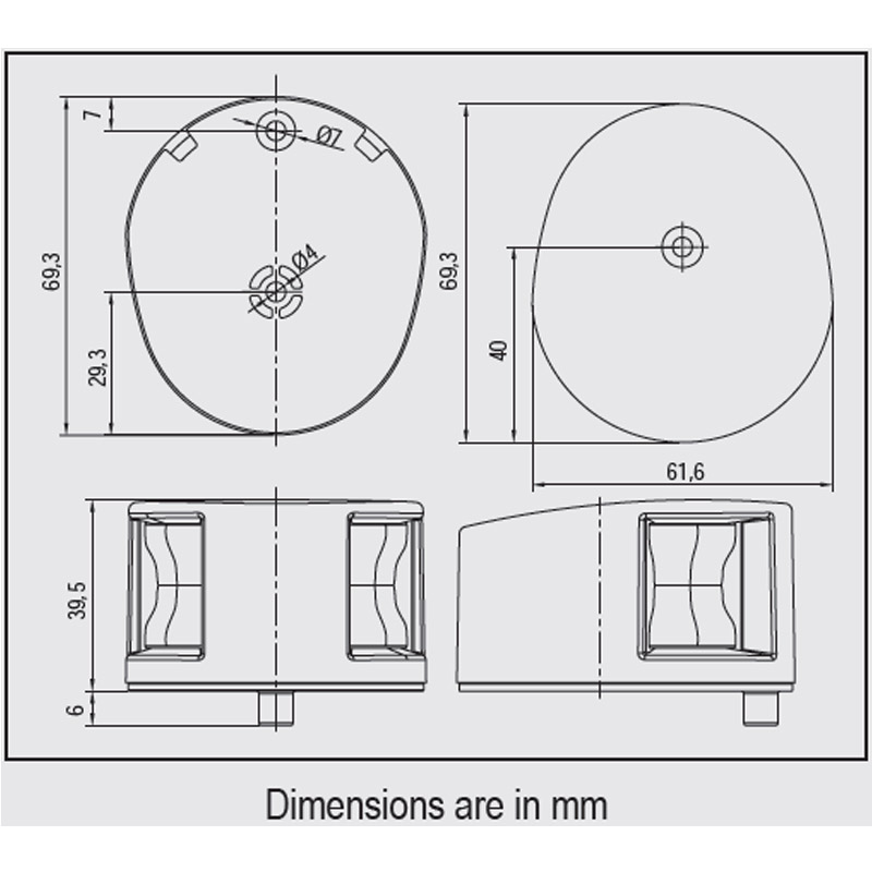 Deck-mounted bi-colour LED lights for boats up to 12 meters, combining red and green illumination in a compact unit.