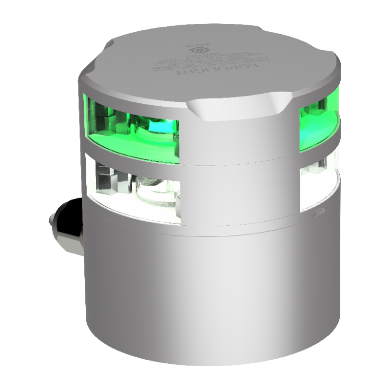 The Lopolight 300-112G2+115G2 combines a 360° white and 360° green light for horizontal mounting, providing excellent visibility for vessels over 50 meters. It features IP68 protection, DNV certification, and durable materials for long-term use.