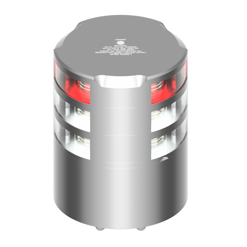 The Lopolight 300-114G2+112G2ST provides 360° red and white visibility in a double configuration with horizontal mounting. Silver anodized, it meets DNV certification, is IP68 rated, and operates with low power consumption for vessels over 50 meters.