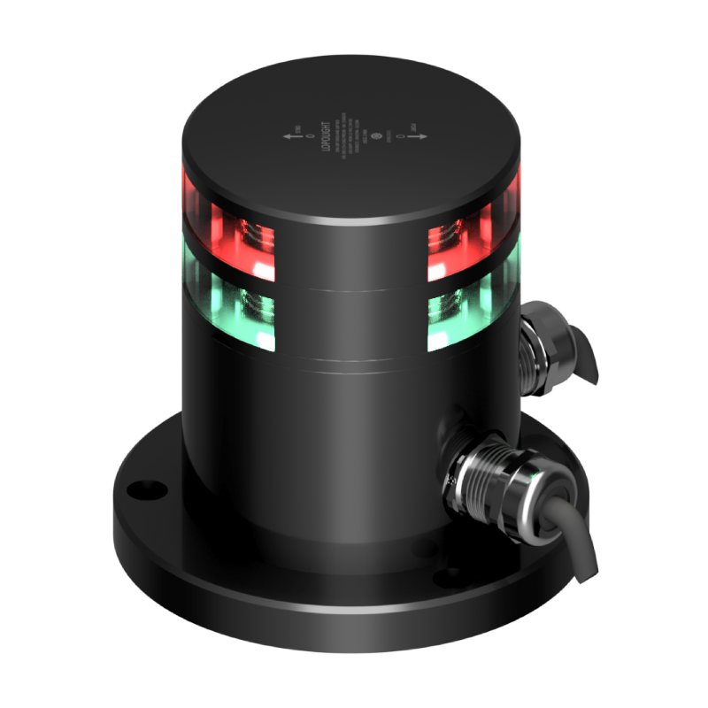 The Lopolight 300-115+114G2-PRO180 combines 180° green and 180° red light for horizontal mounting on vessels over 50 meters. It includes an IP68 POM base, HDPE plate, side cable entry, quality cable glands, and black anodized aluminum construction. Certified to DNV, it offers reliable performance with a weight of 1.43 kg and ensures compliance with international navigation light standards.