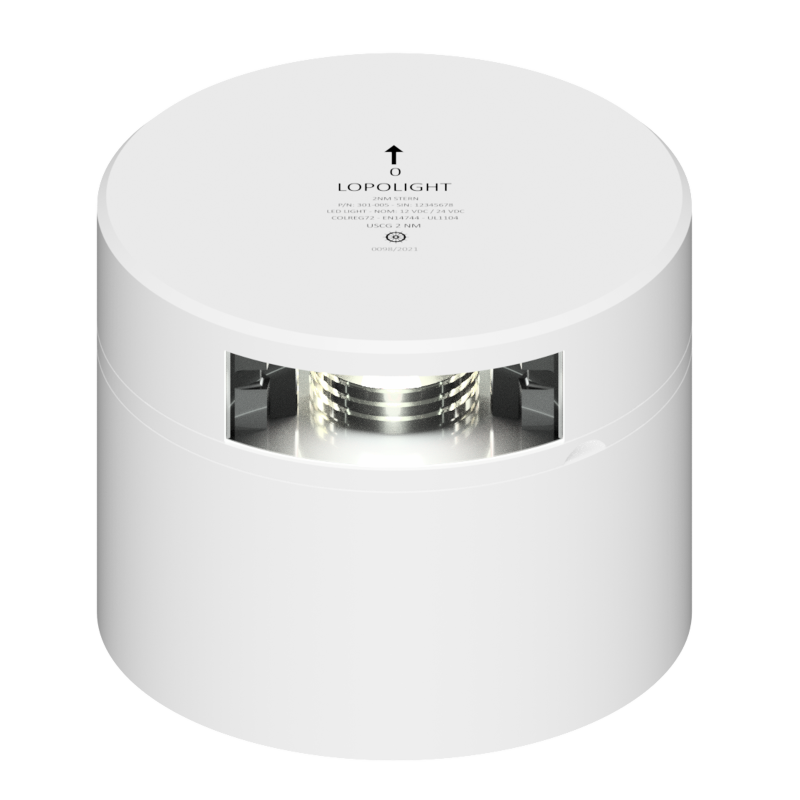 The Lopolight 301-005-WH is a compact white stern light with a ceramic-coated aluminum finish. It offers 2NM visibility, horizontal mounting, plug connector connection, and operates from 10-32VDC. The light is suitable for vessels up to 50 meters and features DNV certification.