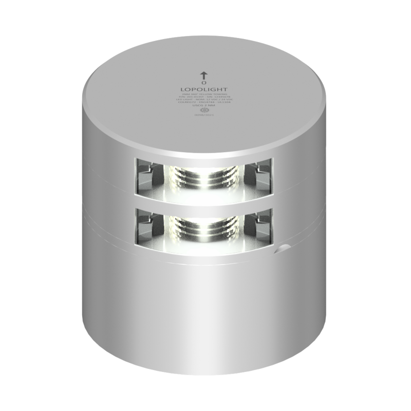 The Lopolight 301-005ST-CD is a white double stern light with silver anodized aluminum construction, providing 2NM visibility. It is horizontally mounted, plug connector ready, suitable for vessels under 50 meters, and DNV certified.
