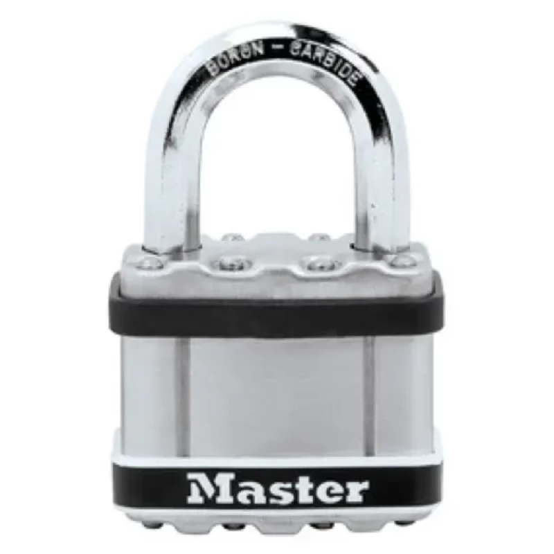 The Master Lock 51mm stainless steel laminated padlock is designed for outdoor durability, featuring a wide laminated steel body, an octagonal boron carbide shackle, a dual ball bearing lock mechanism, and excellent weather protection.