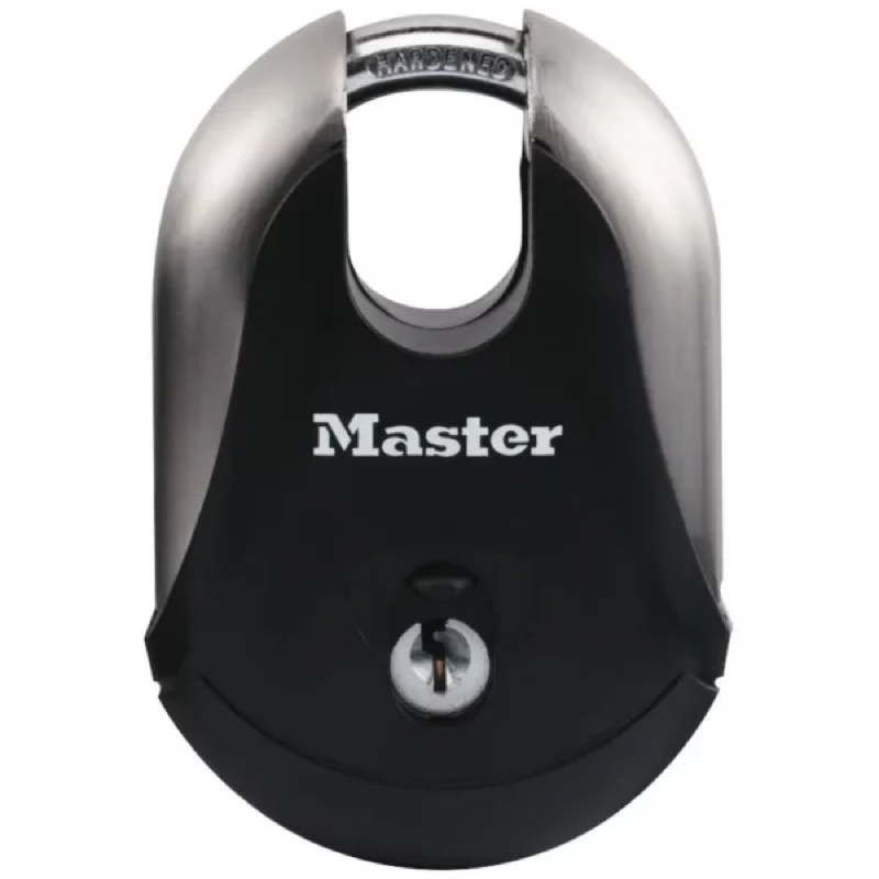 The Master Lock Excell titanium reinforced 60x18mm padlock provides advanced security with a stainless steel body, titanium reinforcement, and a shrouded octagonal boron carbide shackle.