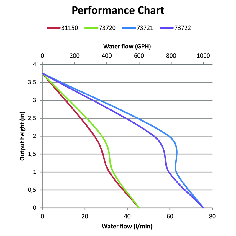 - Pumping capacity: 600GPH through a 19mm (3/4”) hose and 1000GPH through a 25mm (1”) hose.