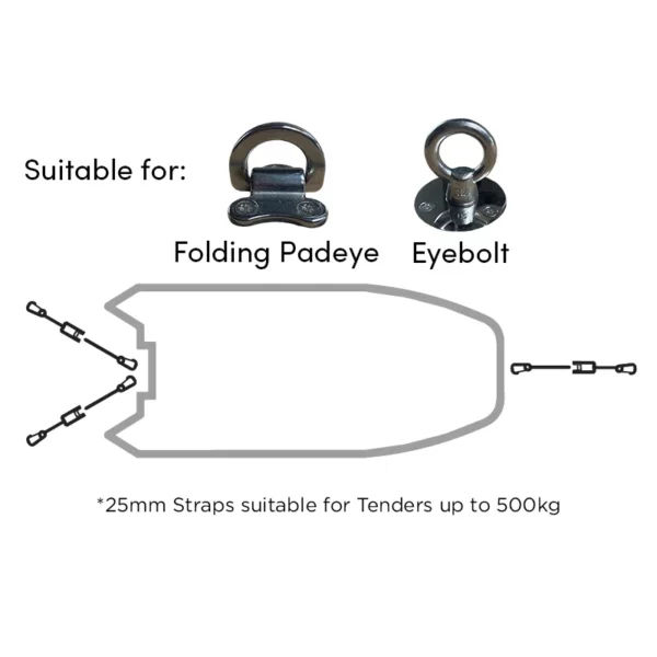 Specifically for tenders up to 500 kg, this one-piece Snap Hook system makes securing your tender fast and easy. Padeyes or eye bolts are not sold separately.