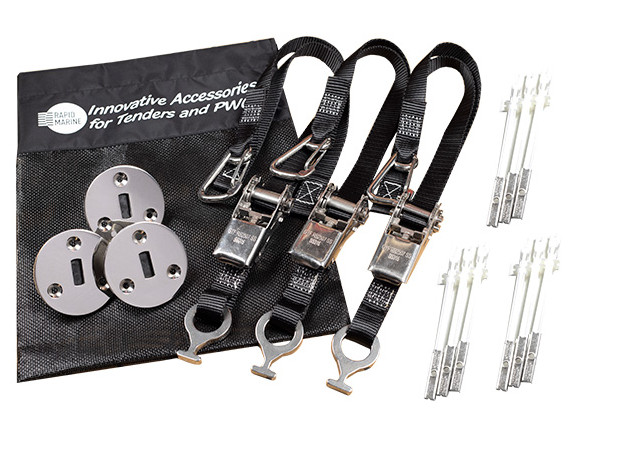 Rapid Marine PE25FFKIT-3-BK includes three flush fitting padeyes, 25mm tie-down straps, fixing bolts, snap switches, a fitting template, and storage bag for a complete tender or jetski attachment solution. Article number RMPE25FFKIT-3-BK, EAN 6095508287262.