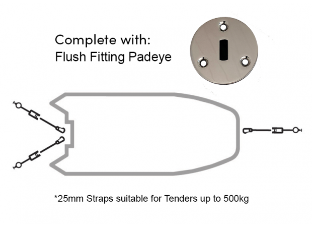 The PE25FFKIT-3-GY kit offers three flush fitting padeyes with grey straps, fixing bolts, snap switches, template, and storage bag, ensuring secure and discreet tender or jetski attachment. Article number RMPE25FFKIT-3-GY, EAN 6095510059024.