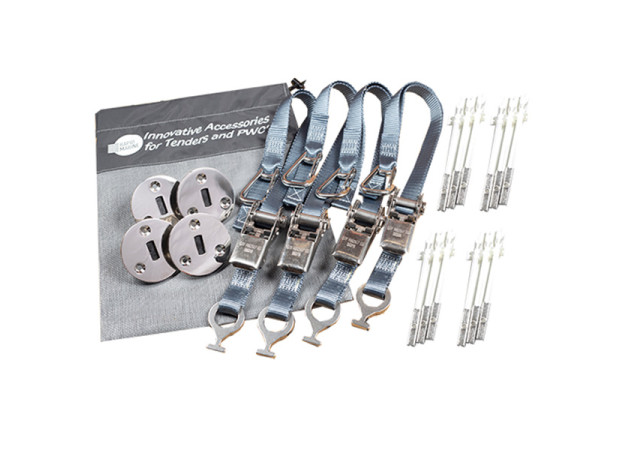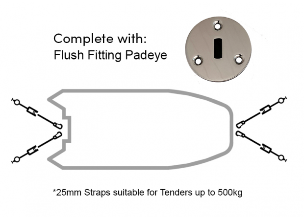 Flush fitting padeye kit with grey tie-down straps for safe and sleek tender storage on the deck.