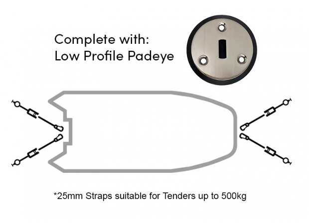 The Rapid Marine PE25LPKIT-4-GY Low Profile Padeye Kit provides a complete set for securing a tender or jet ski, featuring four low-profile padeyes, four 25mm padeye carabiner grey/black straps, twelve snap switches, twelve padeye fixing bolts, an installation template, and a Rapid Marine storage bag, with a recessed design for a discreet look.