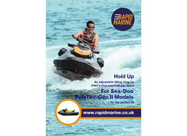 The Rapid Marine RMJ121 is an adjustable jetski sling with a single point attachment for 2020 GTI Polytec-Gen II hulls with lift height restrictions, requiring the RMJ116 spreader beam and supplied with attachment brackets and fitting set.