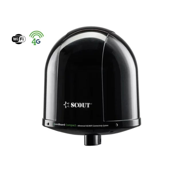 The Scout 4G OnBoard Compact Basic Black provides a complete 4G/WiFi solution for boats, supporting multiple users with a compact 25 cm dome and single SIM slot protected with IP67. It includes two 4G MIMO antennas, Cat 6 speeds up to 300 Mbps, 2.4 GHz WiFi, and LAN connectivity. The system supports app-based or wired management, plug & play operation, coverage up to 20 miles, and HD streaming for multiple onboard devices.