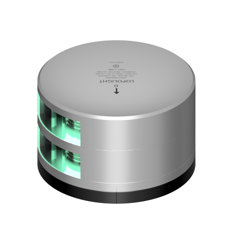 The Lopolight 301-008ST-FB is a horizontally mounted double starboard light with a silver POM flat base and 2.5-meter pre-cabled connection. Providing 2NM visibility, it is lightweight, robust, IP68-rated, and certified for a wide range of vessel sizes.