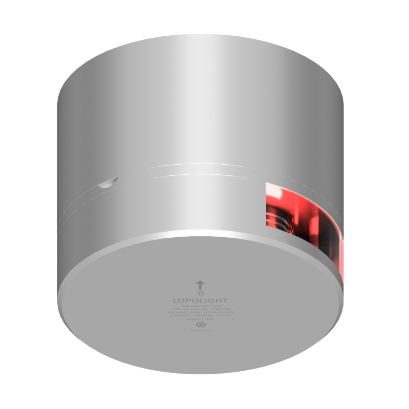 The Lopolight 301-009 REVERSE-CD navigation light is designed for upside-down mounting, providing reliable red light visibility for vessels between 12 and 50 meters. Built with durable materials and certified to international standards, it offers a visibility of 2 nautical miles and an intensity greater than 5.4cd, ensuring safety in marine environments. The light features a horizontal mounting, silver anodized aluminum body, PMMA lens, and plug connector, operating on 10-32VDC with IP68 protection.