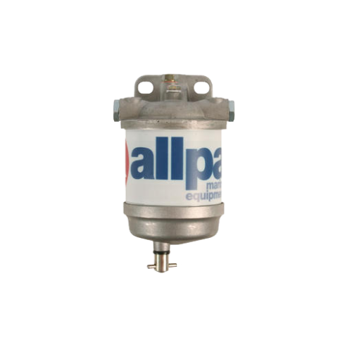 The Allpa Diesel Filter with Water Separator and Transparent Bowl is designed for marine diesel systems to ensure clean fuel by separating water and debris. It features a transparent bowl for easy inspection and supports a flow rate of 50 liters per hour.